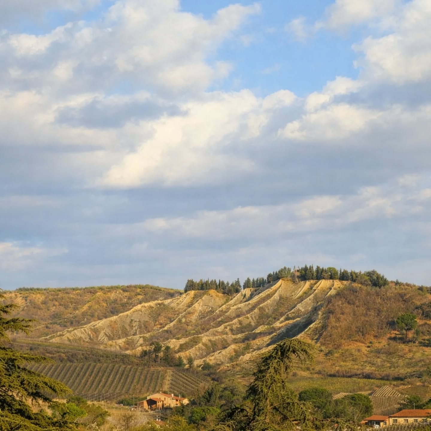 The vineyards are divided into two main estates: the Ca’ di Sopra farm, located on the summit of the Agello hill with exposures ranging from south-east to north-west, and the Ca’ del Rosso farm, which extends along the northern slope. The diversity of the soil, ranging from mature red clays to the blue, fossil-rich soils near the gullies, grants each label a distinctive complexity. The winery itself is a boutique facility where research, study, and analysis are transformed into wine, prioritizing quality over quantity.