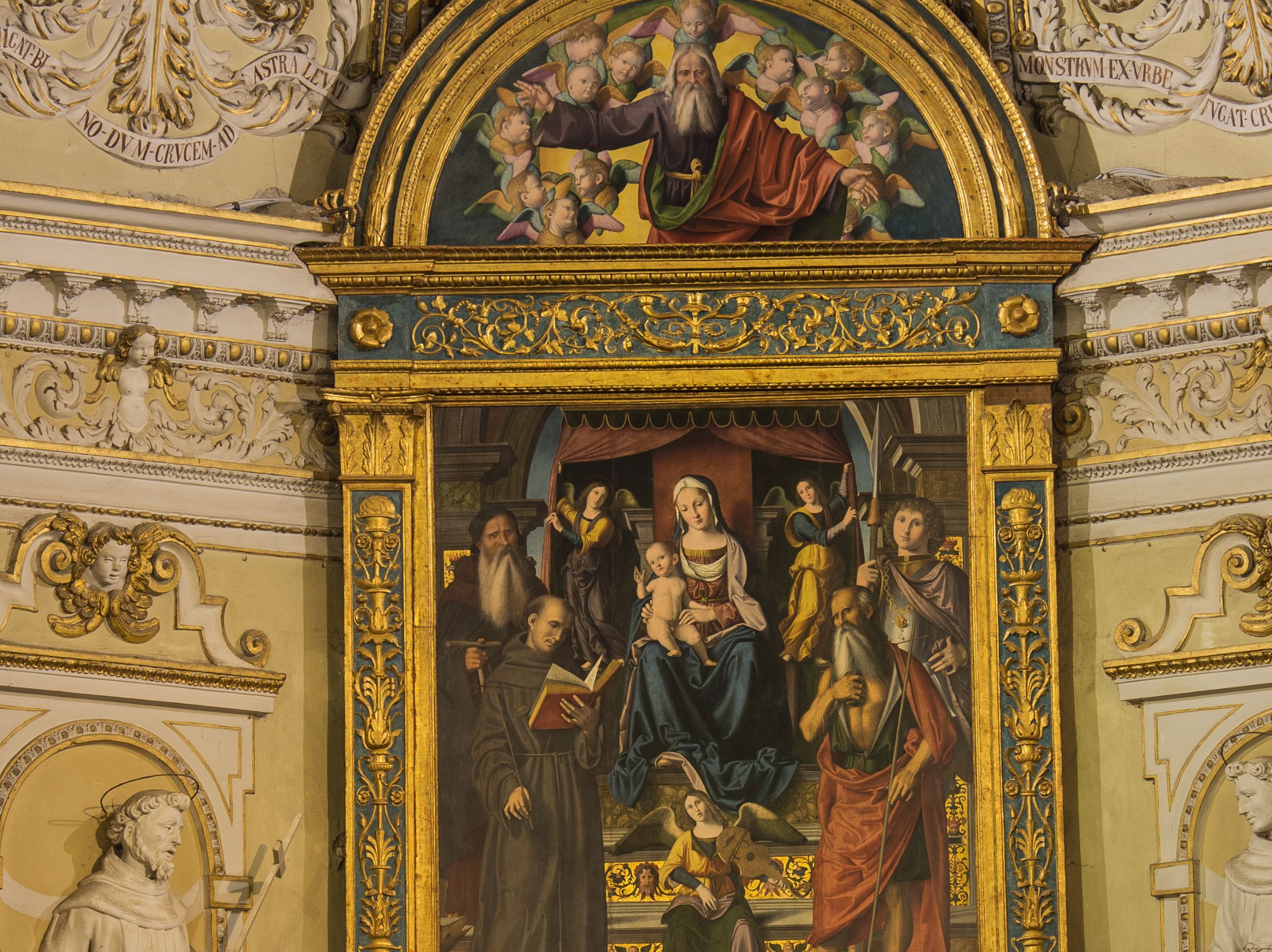 Nell'area absidale si conserva un grandioso coro ligneo, sormontato da decorazioni di santi a stucco bianco e dorato, che fanno da sfondo alla pala d'altare composta dalla Madonna col bambino in trono, fra tre angeli e quattro santi, e dalla lunetta Padre Eterno tra gli angeli, opera del 1520 di Marco Palmezzano, maestro del Rinascimento romagnolo.