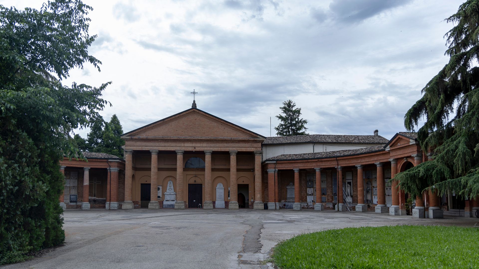 Nel 1858 Costantino Galli ha progettato l'imponente facciata con porticato ad emiciclo di accesso al camposanto, che ha conferito monumentalità al complesso e armonizzato le diverse sezioni.