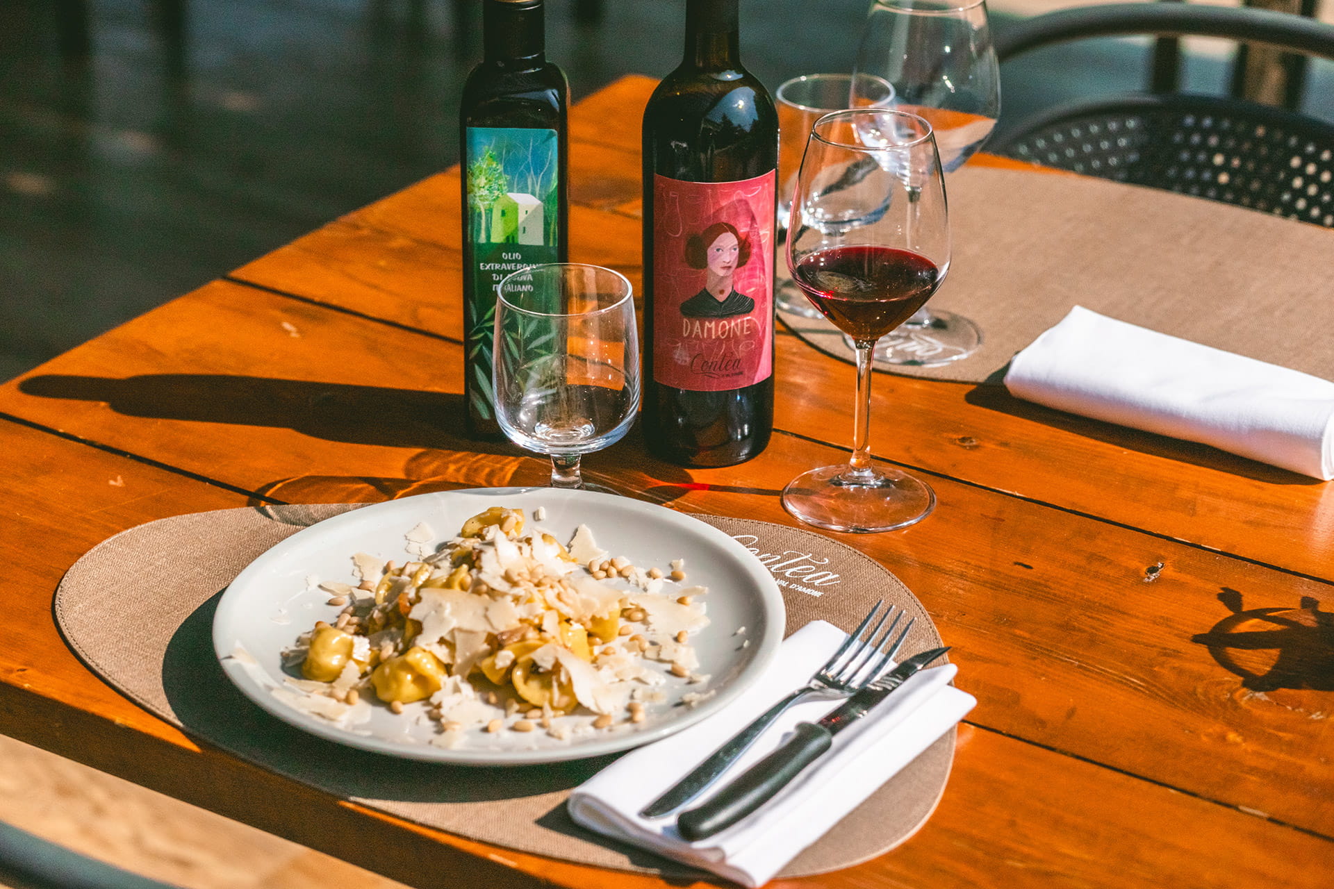 Attorno al ristorante si distendono 4 ettari di vigneto e campi, che producono vino e olio da gustare a tavola.
